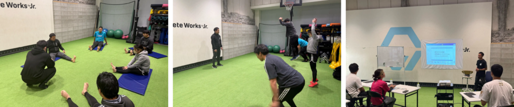 本研修は、トレーナーが「現場で即実践できるレベル」を目指し、アスリートワークスが持つ約30項目の研修カリキュラムの中から、ジュニア指導の核となる実践的プログラムを厳選・カスタマイズし1回3時間・全5回にわたり実施しました。アスリートワークスは、これまで800名を超える会員生徒を指導しており、同じメニューでも多様な子どもたちへの実践事例を蓄積しています。その豊富な経験に基づき、一つひとつのメニューを深掘りし、子どもごとに合った指導方法や効果的なアプローチを伝えられる点が強みです。